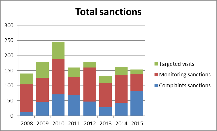 But what interests me is that the number of sanctions in 2015 arising from complaints far outstripped those arising from monitoring visits, which seems quite a departure from the picture of previous years. What is behind this? Is it simply a consequence of our growing complaint-focussed society?