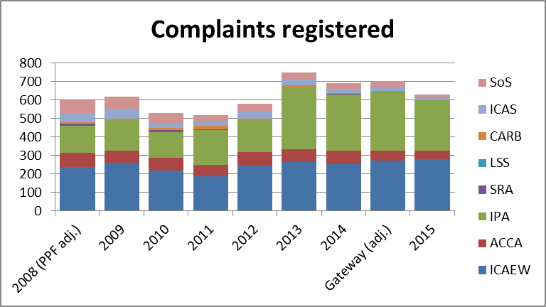 Nevertheless, the suggestion that the IPA’s licensed population is different might help explain the IPA peak in sanctions, mightn’t it? To test this out, perhaps we should compare the number of complaints received by each RPB.