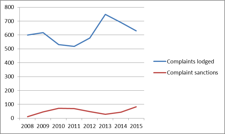The correlation between complaints lodged and complaint sanctions is an interesting one: