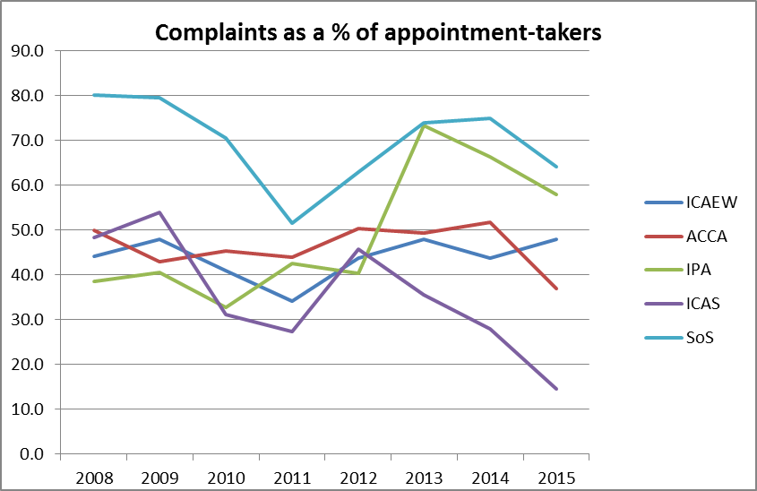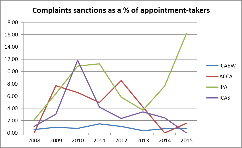Nevertheless, let’s see how these complaints-received numbers would flow through to sanctions, if there were a direct correlation. For simplicity’s sake, I will assume that a complaint lodged in 2013 concluded in 2015 – although I think this is highly unlikely to be the average, I think it could well be so for the tricky complaints that lead to sanctions. This would mean that, across all the RPBs (excluding the Insolvency Service, which has no power to sanction SoS-authorised IPs in respect of complaints), 12% of all complaints led to sanctions. On this basis, the IPA might be expected to issue 36 complaint-led sanctions, so this doesn’t get us much closer to explaining the 76 sanctions issued by the IPA.