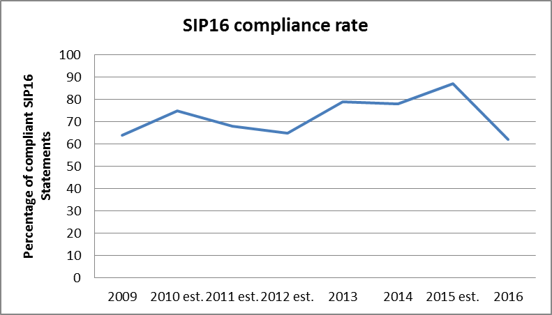 There has been a significant drop in the reported rate of SIP16 compliance – at 62% of 2016’s SIP16 statements considered wholly compliant, it is the lowest annual rate on record (note: several years are estimates because not all SIP16 statements received were compliance-reviewed):
