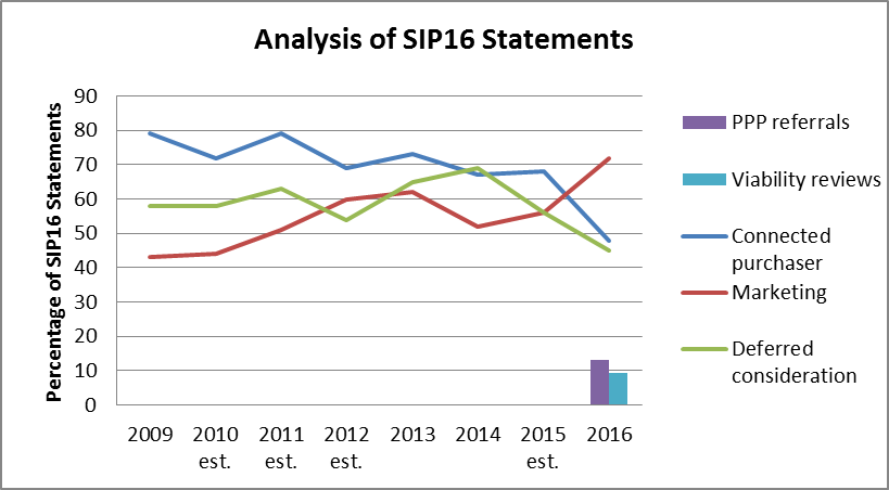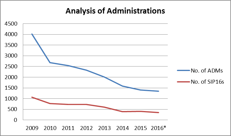 So could it be that Administration sales are being shifted out of the pre-pack definition either by being completed before Administration or perhaps negotiations are not starting until after appointment? This doesn’t ring true either: SIP16 statements as a percentage of the total number of Administrations has been fairly steady since the introduction of the Pool (2015: 29%; 2016: 24%):