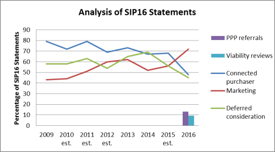 I certainly think that the SIP16 pressure has influenced attitudes towards marketing, as this graph indicates. Even in cases where the offer on the table looks too good to beat, I suspect that many view some marketing effort as essential to shield one from criticism. I doubt that safety-blanket marketing in these cases increases realisations and it will increase costs, but if it answers the sceptics’ questions about possible undervalue sales, then it seems to have everyone’s blessing.