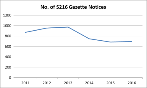 Perhaps hurdles are being overcome by having connected party sales accompany liquidations instead of Administrations. Well, I was surprised to discover that the numbers of Gazette notices for S216 re-use of a prohibited name do not follow a trend suggesting more sales in liquidation: