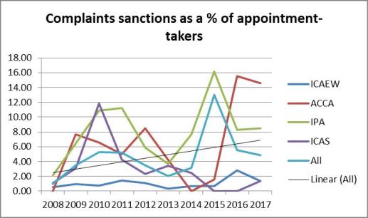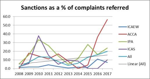 The trendline here suggests that a complaint was twice as likely to end up in a sanction in 2017 as it was 10 years’ ago.