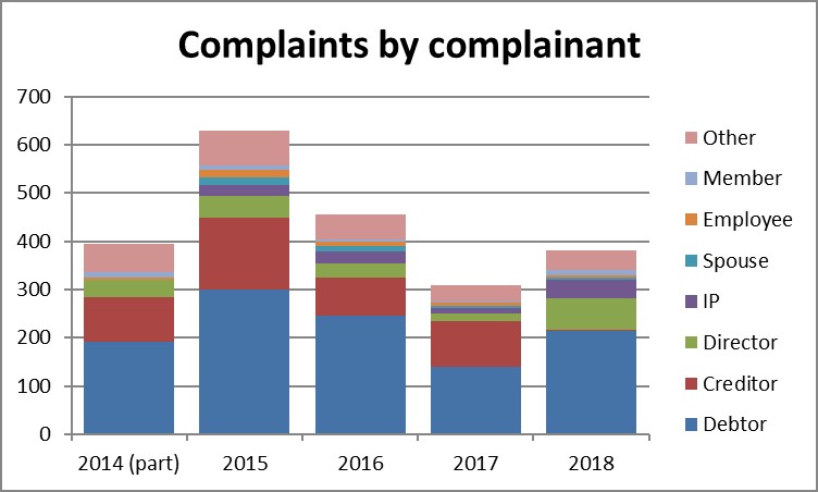 • Only two complaints (of the 381 referred to the RPBs) had been received from creditors! As usual, debtors were the most frequent complainers, but complaints lodged by directors and IPs showed quite an increase