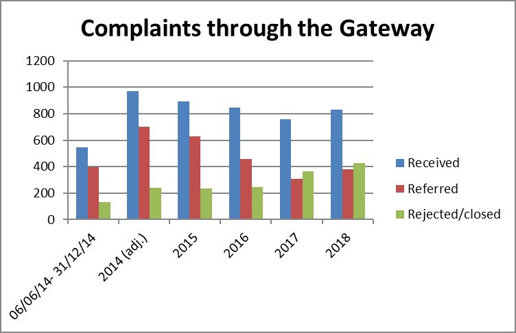 Complaint numbers are back up to the 2016 level: in 2016, 847 complaints were lodged and in 2018 the number was 830.  However, many more complaints fail to make it through the Gateway.  In fact, every year, the number rejected/referred has increased, even though the trend in complaint numbers shows an overall decrease.  In 2017, 48% of complaints were rejected or closed and this percentage increased to 52% last year.