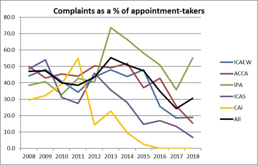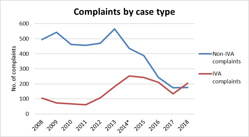 Thanks, Mark. Yes, that is worth remembering, I agree. It’s perhaps worth bearing in mind also that non-IVA IPs deal with far fewer cases but usually with a great deal more creditors (and directors, employees, shareholders etc.) per case, so the number of potential complainants probably never bears any resemblance to the number of cases. The graph of complaints by type, however, indicates to me that, while case-loads have increased for non-IVA IPs (although admittedly not quite as dramatically as for IVA IPs), complaint numbers have dropped significantly over the past few years, but this has not been the case for IVA complaints. As you say, though, complaints-per-IP naturally is likely to be higher for IPs managing a large portfolio administered by a large team. Thanks for reminding me of that.