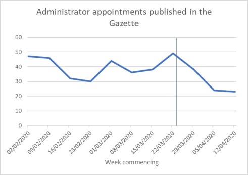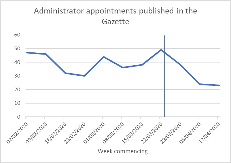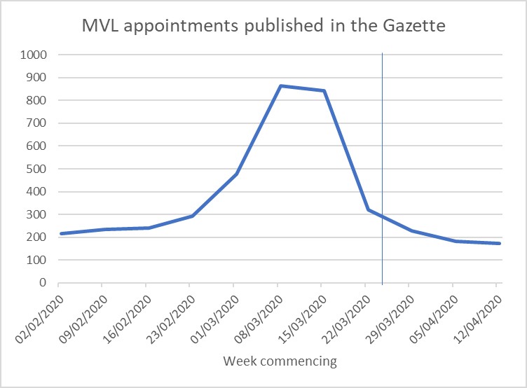 At https://insolvencyoracle.com/appt-stats/ (and below for this post only), I have added graphs showing the ADM, CVL and MVL appointment notices published in the Gazette each week over the past couple of months. I intend to update these graphs on a weekly basis. The vertical line marks the day that the UK went into lockdown.
