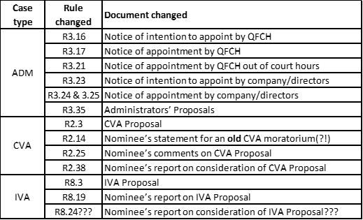 As regards the last document listed above, in fact there has been no change to R8.24(2)(c), which requires the Nominee’s report on the consideration of the IVA Proposal to “state whether the proceedings are main, territorial or non-EU proceedings and the reasons for so stating”… but we assume that this was mistakenly omitted.