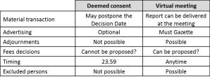 The IA states that “it is not anticipated that the time taken to undertake a virtual meeting will be any more or less than the time taken to undertake a physical meeting” – I agree – but it then states “where a physical meeting is not being held the proportion of instances where a virtual or remote meeting is held is likely to be small, given that deemed consent will be available as well as other cheaper methods”. The IA then applies a best estimate of 50% reduction in meetings, whether virtual or physical, and eliminates entirely the time costs of an estimated 1.5 hours for holding a meeting. Crazy! As is clear above, there will barely be an opportunity to use deemed consent and, as the time incurred in completing unattended meetings is mostly about collating and considering proofs and proxies and drafting minutes, these pretty-much will still need to be spent in any other decision procedure. Okay, business by correspondence will be cheaper than a physical or virtual meeting where people actually turn up, but it is not cost-free!