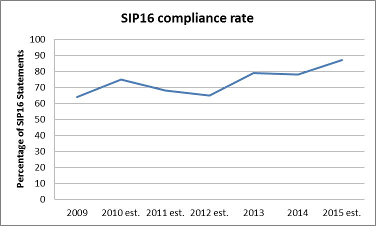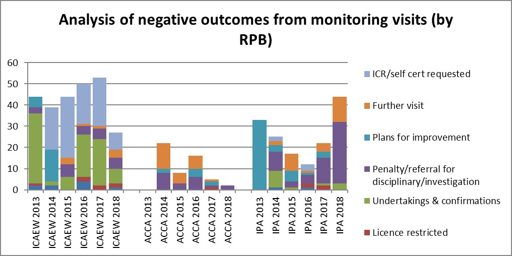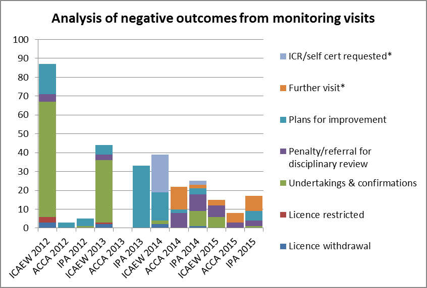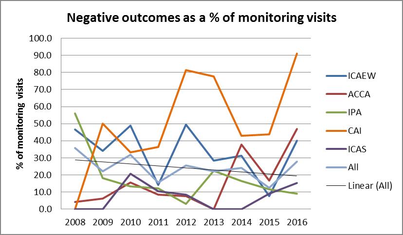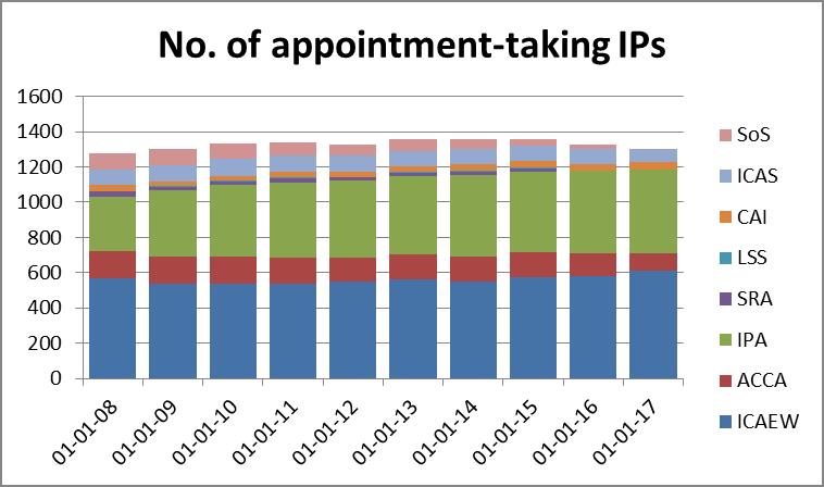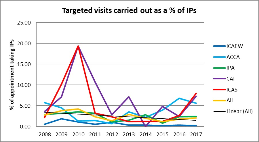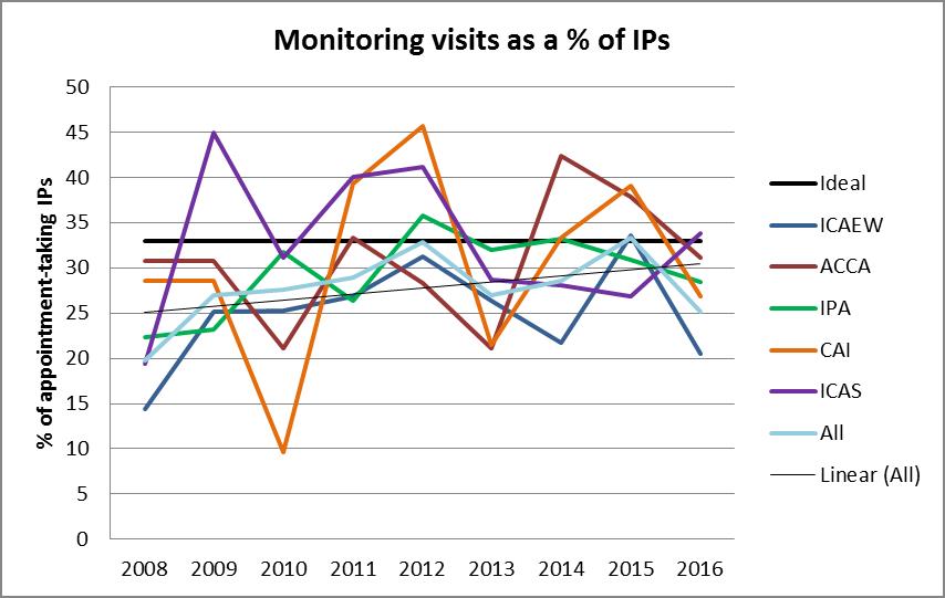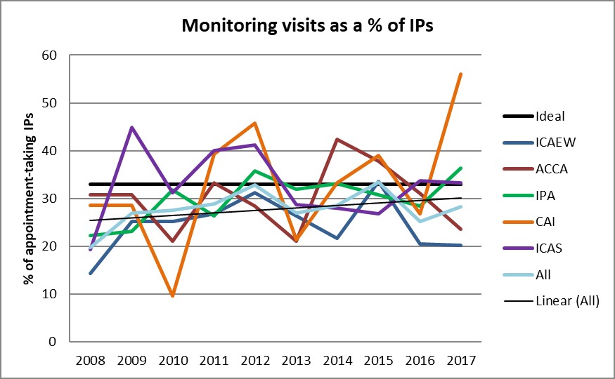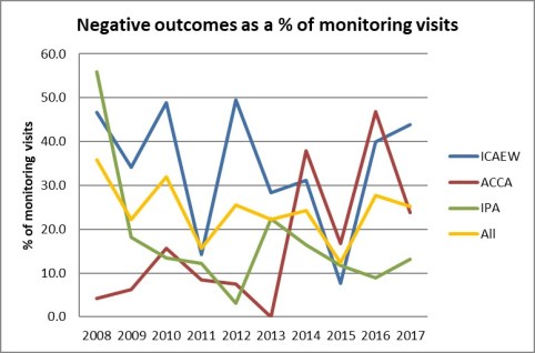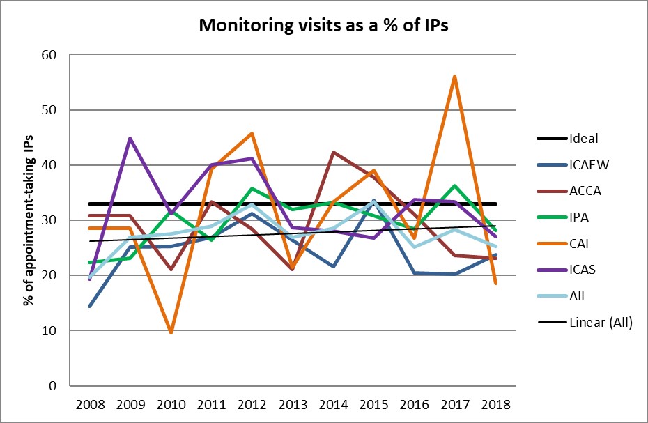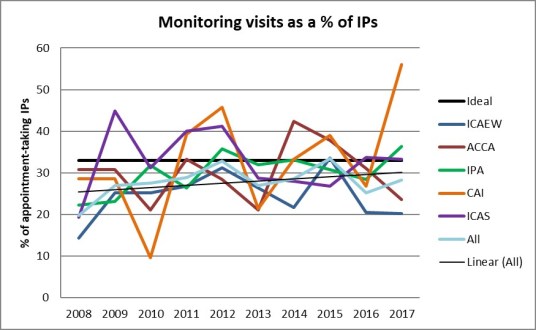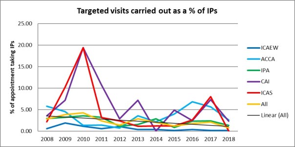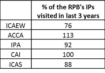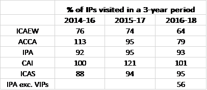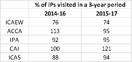 The ICAEW’s 64% may also reflect its different approach to visits to IPs in the largest firms: the ICAEW visits the firm annually (to cover the work of some of their IPs), but, because of the large number of IPs in the firm, the gap between visits to each IP within the firm is up to 6 years. I cannot attempt to adjust the ICAEW’s figure to exclude these less frequently visited IPs, but suffice to say that, if they were exceeded, I suspect we might see something approaching more of a standard c.3-yearly visit for all non-large firm ICAEW-licensed IPs.