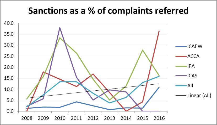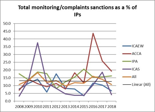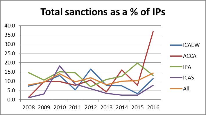There’s not a lot that can be surmised from the number of sanctions issued by the other two RPBs: they’re a bit spiky, but it does seem that, on the whole, the ICAEW and ICAS has issued much fewer sanctions. It seems from this that, at least for last year, you were c.half as likely to receive a sanction if you were ICAEW- or ICAS-licensed as you were if you were IPA- or ACCA-licensed.