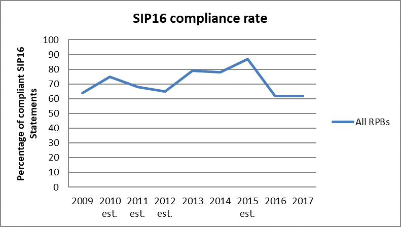 The Insolvency Service reports that SIP16 statement compliance has improved: since the RPBs took on monitoring compliance in late 2015, the annual non-compliance rate has dropped from 38% to 23%. The report states, however, that: